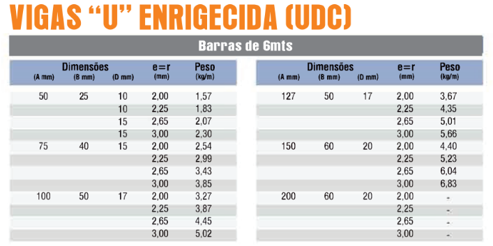 A Viga U Enrijecida, ou Perfil UDC, é um perfil de aço SAE 1020, disponível em barras de 6 metros, projetado para suportar cargas pesadas. Amplamente utilizada na construção civil, serralheria e indústrias, é ideal para portões, corrimões, telhados e estruturas metálicas.